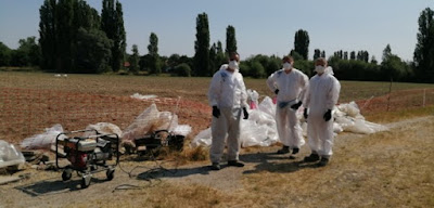 Op 16 juni werden losse stukken asbest van het terrein geraapt door mannen in witte pakken. Ongeveer 20 zakken asbestpuin werden afgevoerd.